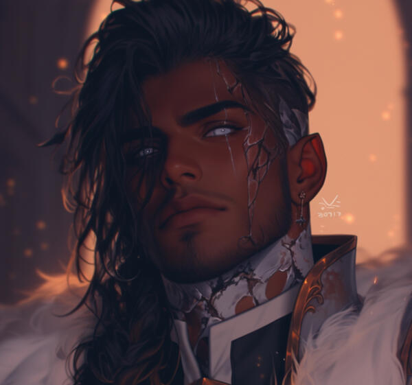 ㅤnameㅤㅤ Alaric Solayne/"The Broken Flame" (used by enemies)ㅤageㅤㅤ 34.ㅤpronounsㅤHe/Him.ㅤspeciesㅤAasimar (Celestial-blooded).Appearanceㅤ6'4", muscular, deep umber skin that has scars of cracked, silver-laced divine burn marks stretch across one side of his face and neck , long blackened bronze hair is often tied back in a simple braid, piercing silver eyes one is cracked with a faint vein of golden.LikesSilent mornings, sparring routines, old scripture (even if he no longer believes), polished armor, the warmth of a campfire after battle, loyalty shown through action, the sound of a heartbeat when everything else is quiet.DislikesBlasphemy, unnecessary cruelty, broken promises, fire (despite being surrounded by it), being touched without permission, people who treat oaths like suggestions, Sorren's smug grin (though he secretly watches for it).